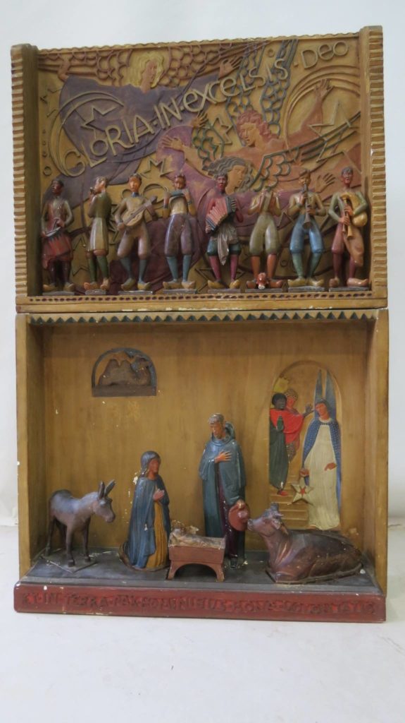 Crèche du musicien Olivier Messiaen. Ensemble en terre cuite, encrassé et pertes de la polychromieCrèche du musicien Olivier Messiaen. Nettoyage aqueux et reprise de la polychromieCadre du XVIIe siècle, classé Monument Historique, église de Crots Haute Alpes